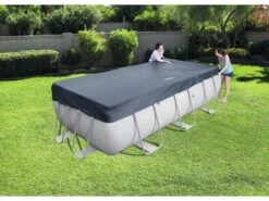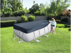 Afdekkleed voor zwembaden met een stalen frame. Dit kleed valt over het zwembad heen. De maat van het kleed is iets kleiner dan de afmeting van het bad, omdat daarbij uitgegaan wordt van de buitenmaat van de iets uitlopende poten onderaan. Incl. koord om het kleed vast te zetten. Afmeting: 396×185 cm.