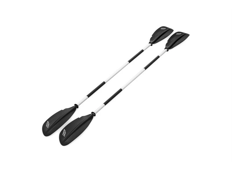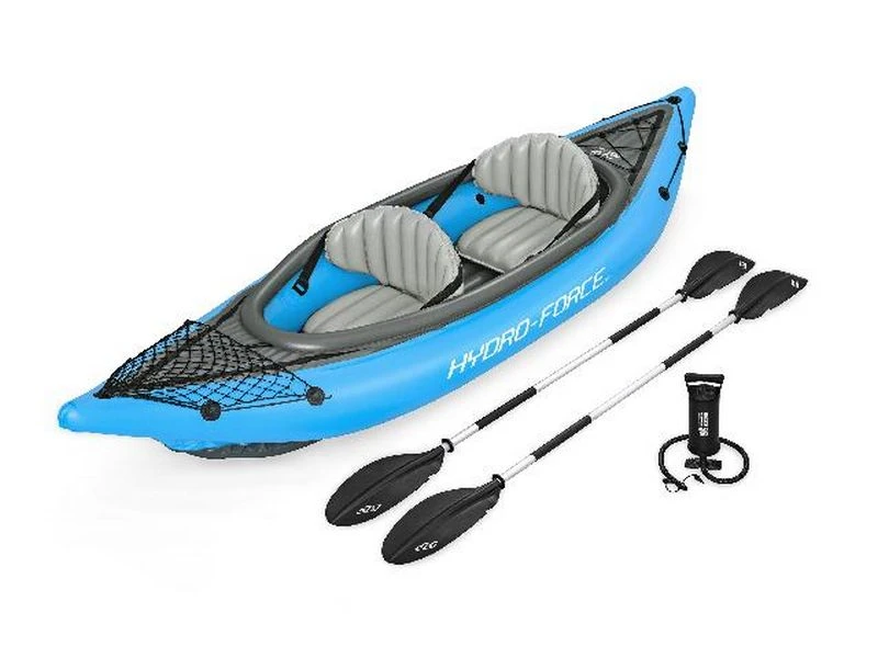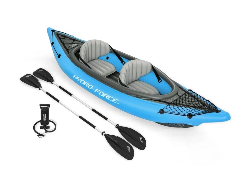 2 Persoons kajak met 3 luchtkamers, gemaakt van duurzaam PVC. Stevige en strakke opblaasbare bodem, 2 afneembare vinnen en een comfortabele cockpit met opblaasbaar zitje. Koord voor het stouwen van spullen voor en achter en een grijpkoord rondom. Incl. handpomp, peddel en reparatie patch. Max. gewicht: 180 kg. Afmeting (LxBxH): 331x88x45 cm.