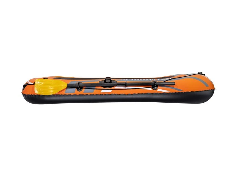 Boot met 3 luchtkamers voor 1 volwassene en 1 kind. Max. gewicht: 120 kg. Snel op te blazen. Rondom een koord, opblaasbare bodem voor extra comfort, sterke handgreep, vaste dollen, een sleepring met sleeplijn en een reparatiepatch. Incl. 1 paar riemen(124 cm) en een voetpomp (13 cm). Afmeting: 188x98x30 cm.