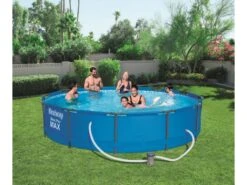 Rond stalen frame zwembad. Uitgerust met framelink systeem met corrosiepreventie, een 3 laags PVC band ter ondersteuning, kunststof hoekstukken en 2 bekerhouders. Zeer gemakkelijk te installeren. Van duurzaam Tritech materiaal, bestand tegen UV stralenen chloor. Incl. 12 V. cartridgefilter van 1,2 m³/u. Gemiddeld 1x per 2 weken cartridge vervangen, cartridge type I. Watercapaciteit (90%): 6.473 liter. Afmeting: 366×76 cm.