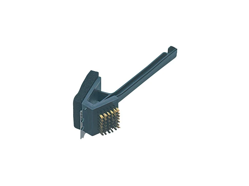 De 3 in 1 plastic roosterborstel heeft messing haren, nylon schuursponsje en een metalen krabber voor het grondig schoonmaken van je barbecue. Weken, schrobben en schrapen in één!