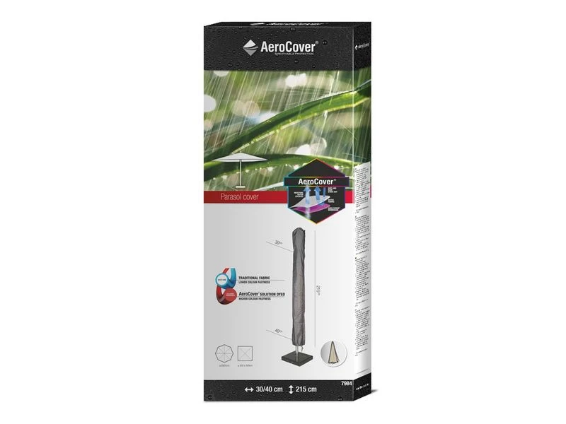 Parasolhoes 215×30/40cm van AeroCover. Ademende parasolhoes geschikt voor parasols tot Ø 4,0m. Handige ingenaaide stok om uw parasolhoes makkelijk over de parasol te plaatsen zonder een trap te gebruiken. AeroCover parasolhoezen zijn ademend, waterbestendig, reduceren condensvorming en gaan schimmelvorming tegen. De stof heeft een hoge kleurechtheid dankzij de door en door geverfde vezels. Een AeroCover beschermhoes verlengt de levensduur van uw parasol. AeroCover stoffen zijn 100% waterdicht, de naden zijn, net als elke ander hoes, spatwaterdicht.