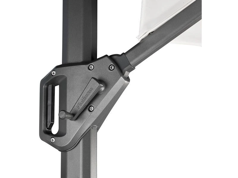 Zweefparasol Voyager T1 Ø3.0 van Platinum. Achterwaarts kantelbaar en 360 graden draaibaar. De Voyager T1 zweefparasol is uitgevoerd met een 220 grams antraciet polyester doek voorzien van water- en vuilafstotende coating. Dit doek heeft een hoge mate van kleurechtheid is getest in klasse 5-6 (goed – zeer goed). Een zweefparasol heeft het grote voordeel dat de paal van de zweefparasol niet zo nadrukkelijk aanwezig is als bij een gewone parasol en wat verder van uw tuinset geplaatst kan worden. Hierdoor kan de gehele ruimte onder de zwevende parasol benut worden. Houd uw parasol als nieuw en dek deze alleen af met een AeroCover ademende parasolhoes wanneer u deze langere tijd niet gebruikt. Granietvoet op foto tegen meerprijs leverbaar. In plaats van deze zweefparasols te verzwaren met tegels kan deze ook rechtstreeks op een 90kg parasolvoet van Platinum geplaatst worden. Deze zijn met wielen leverbaar zodat de parasol makkelijk te verplaatsen is.