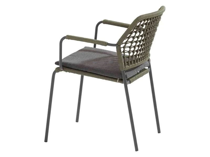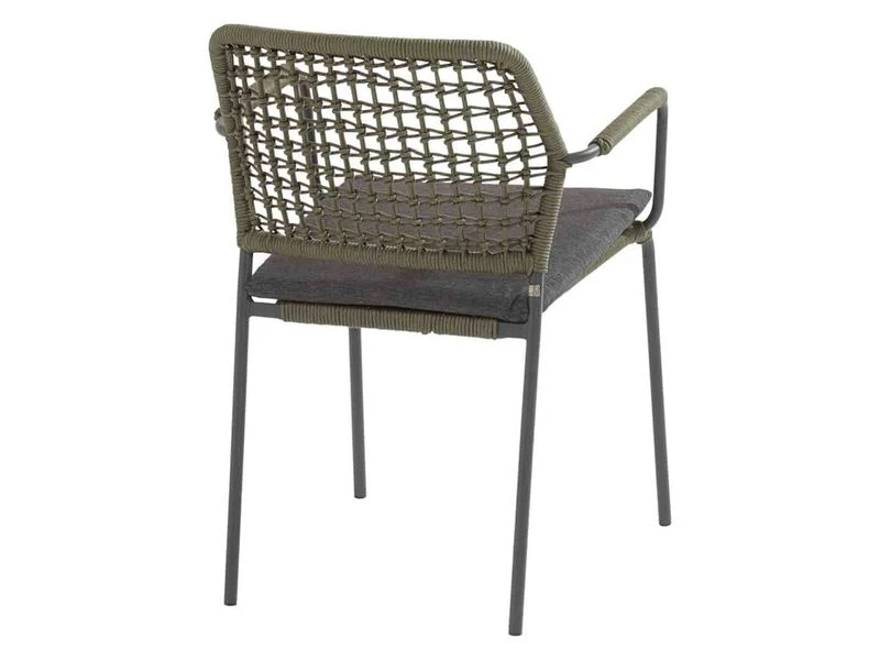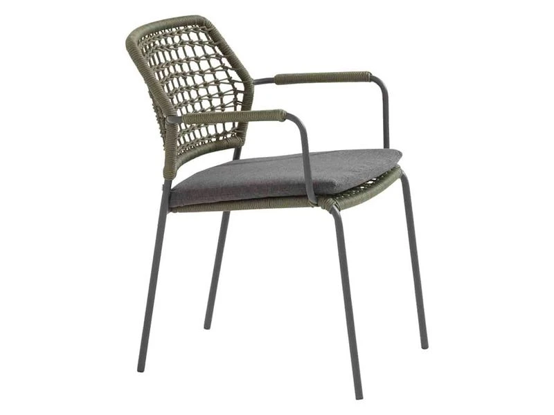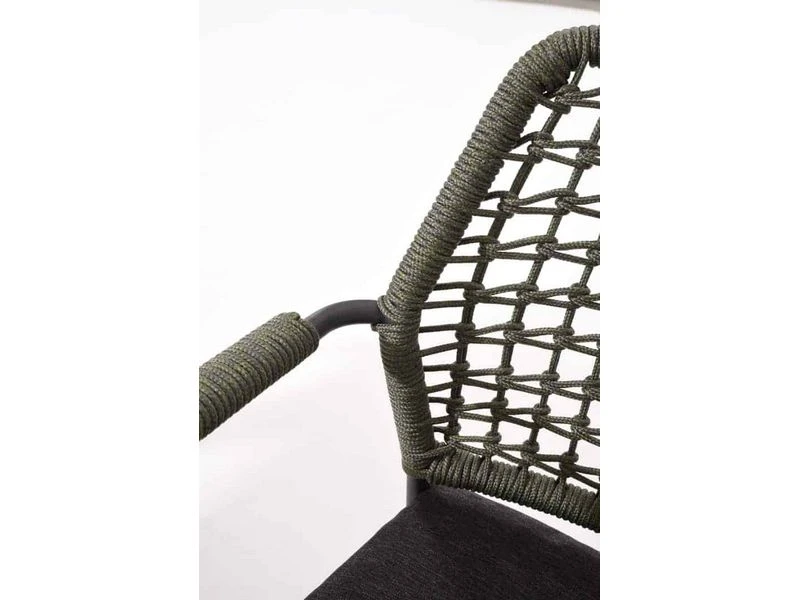 Deze stoel is uitgevoerd in de kleur groen. Het rope materiaal is weerbestendig en in een blok-patroon geknoopt. Het rope komt op subtiele wijze weer terug in de armleuningen.
