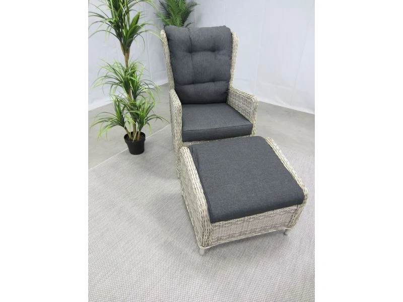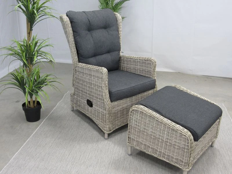 De Bombay gasveerverstelbare tuin-lounge stoel, is gemaakt van een aluminium frame met daar omheen een 6,5 mm halfrond vlechtwerkdraad in de kleur earl natural inclusief antracietkleurige zit- en rugkussens. Deze stoel wordt geleverd met voetenbank. Door de verstelling van de rug, kunt u altijd zitten op de door u gewenste manier.