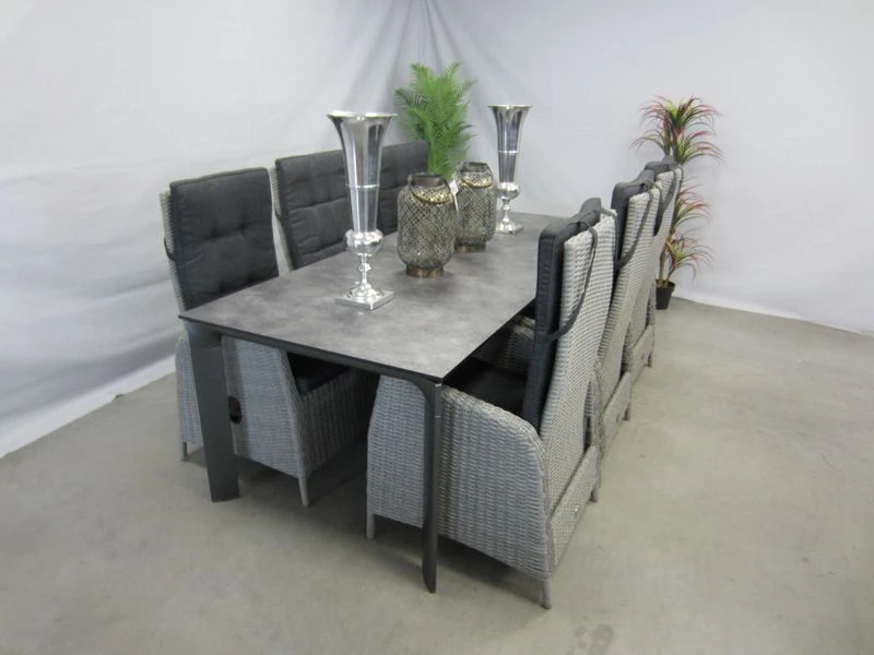 6 verstelbare tuinstoelen met hpl tuintafel 220 x 95 cm.