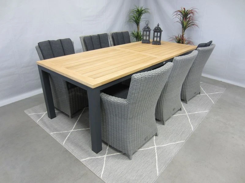 De alonzo tuinstoel heeft een hoog zitcomfort. Frame is van aluminium en het gevlochten draad is van kunststof. Deze dining-tuinstoel is geheel onderhoudsvrij. Het kussen is gemaakt van polyester, wat betekent dat het kleurecht is en vuil en waterafstotend is. De Palazzo teak-tuintafel heeft een Teak hout tafelblad en een aluminium frame dat een antraciet coating heeft. De tafel is 1 meter breed, 2,4 meter lang en 0,76 meter hoog.