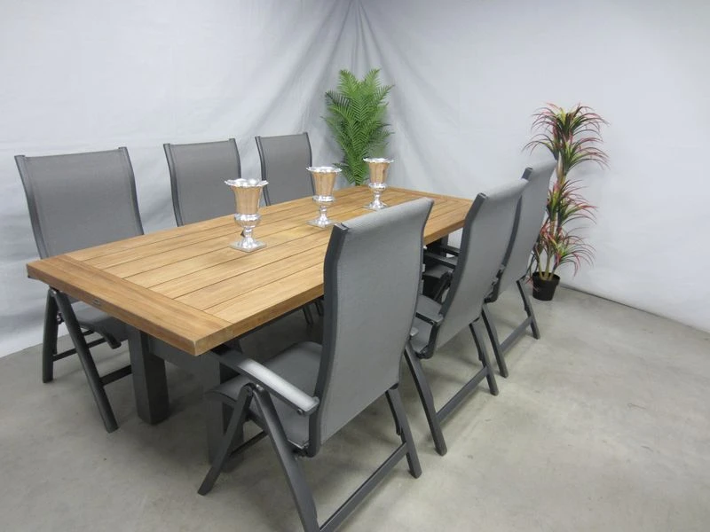 6 verstelbare tuinstoelen met teak tuintafel 240 x 100 cm.